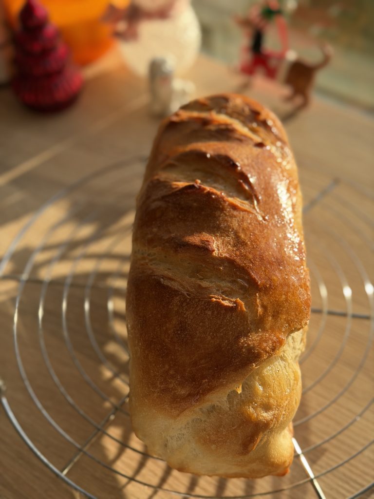 Preîncălziți cuptorul la 275°C și puneți o tavă cu apă pentru abur înăuntru. Coaceți pâinea timp de 20 de minute cu tava cu apă, apoi scoateți-o și coaceți încă 30 de minute.